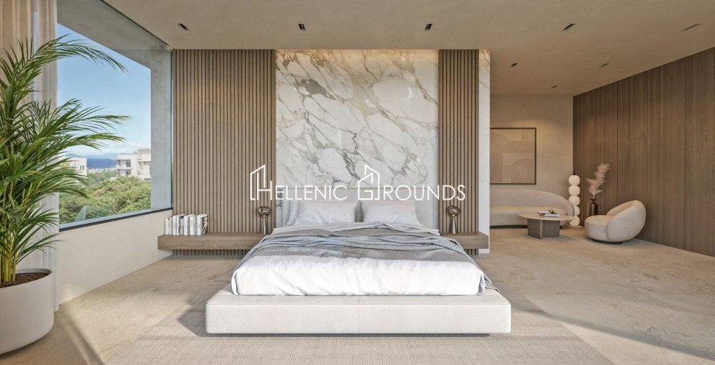 The penthouse offers four elegant master bedrooms, each with its own en-suite bathroom, as well as a guest WC. The open-plan living and dining area boasts floor-to-ceiling windows that flood the space with natural light and frame the panoramic views of Glyfada and the Athenian Riviera.