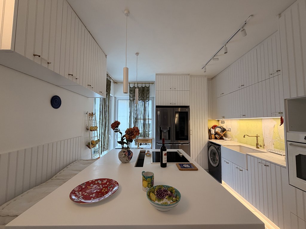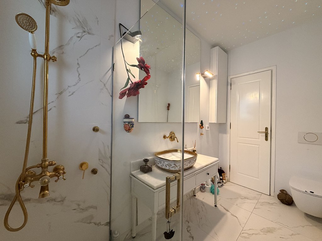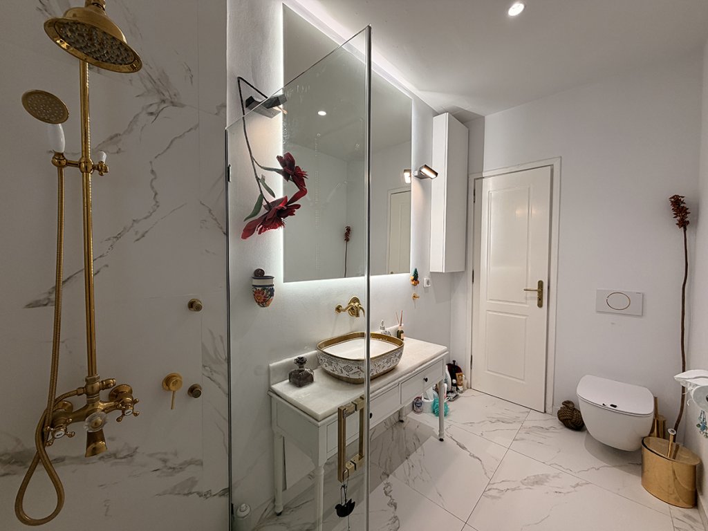 The layout includes two spacious bedrooms with the possibility of creating a third, two full bathrooms, and a comfortable living area. The highlight of the property is the impressive 100 sq.m. terrace, offering partial sea views and exceptional outdoor living potential.